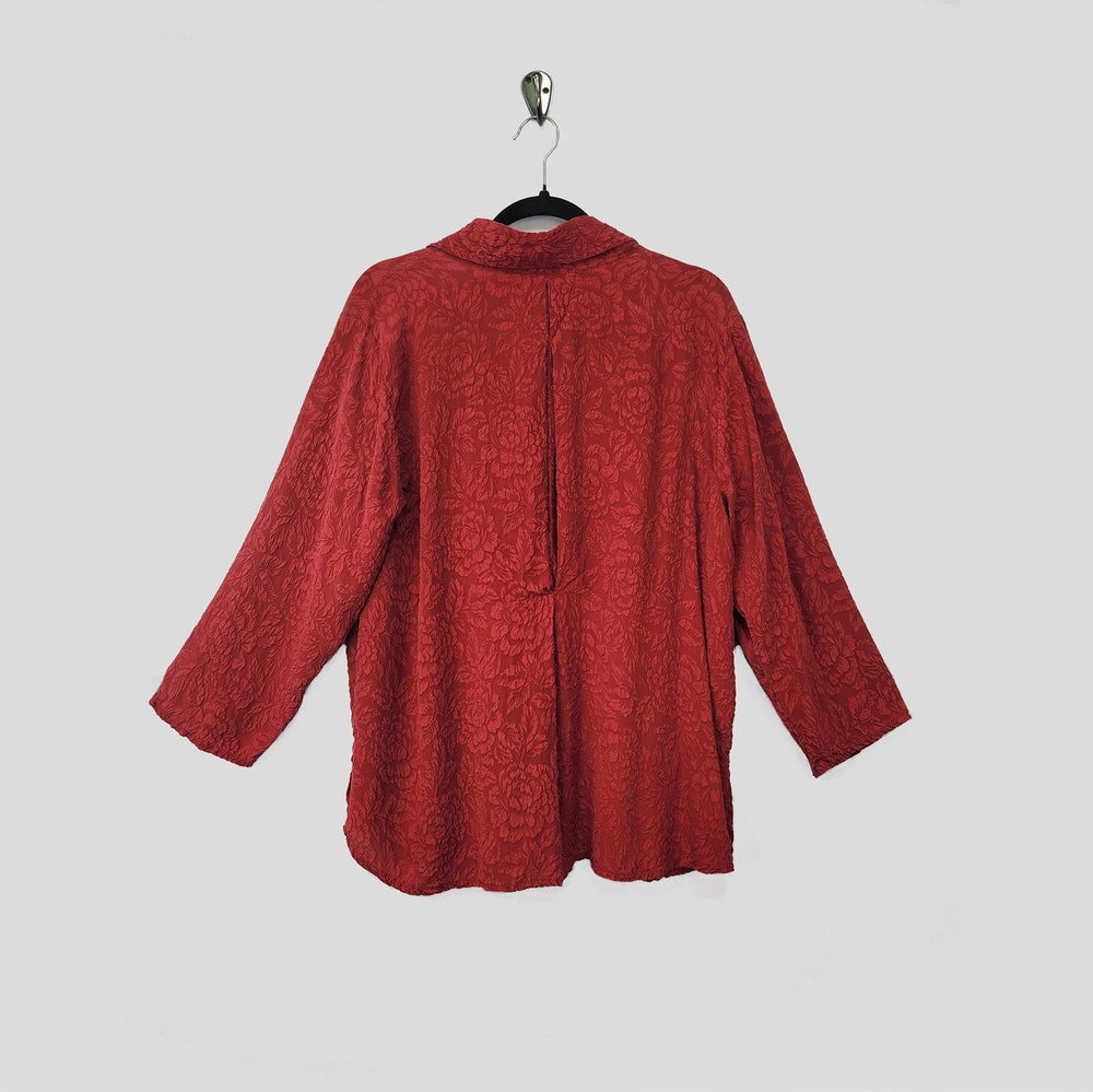 Stylish and functional Red textured silk shirt, crafted from embossed silk, transitions effortlessly from day to professional wear or chic jacket. Features classic button-down front, 3/4 sleeves, shirt collar, and pleated back for a touch of flair and a flattering fit.