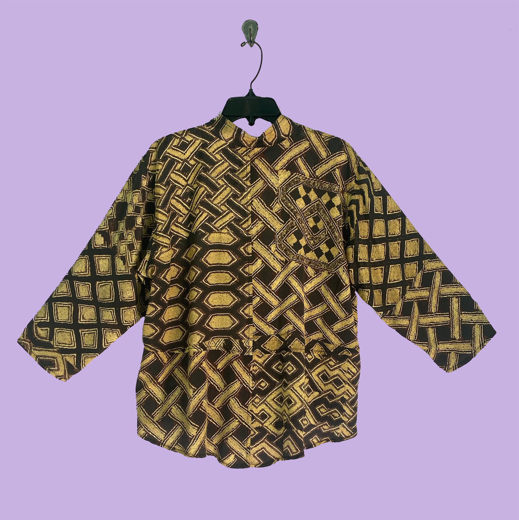 Elevate your style with a Venice Top in Afibi Tan printed silk button-down shirt. It boasts a distinctive paneled bottom design and refined mandarin collar, combining comfort with a touch of sophistication. Perfect for those who appreciate unique, high-quality fashion.