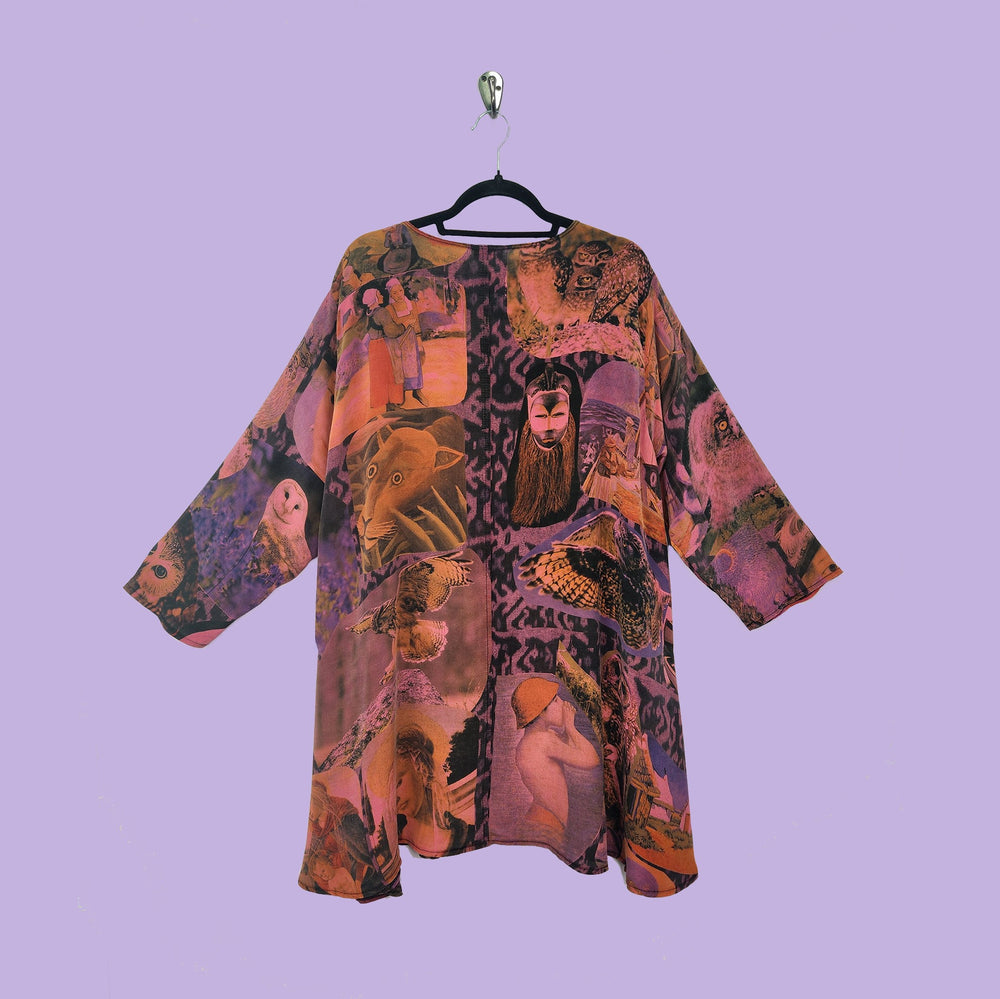 Embrace timeless elegance with our knee-length Pink Owl printed silk tunic, featuring a classic crew neck, inset pockets and button-down front. This piece combines sophistication with comfort. This vibrant print adds a touch of artistic flair to your ensemble.